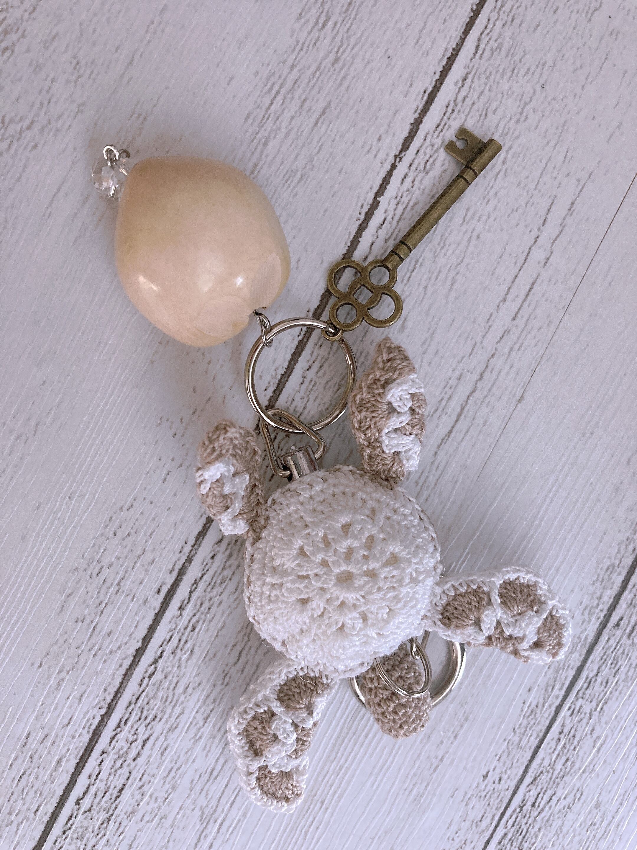 レース糸で編んだフラワーモチーフのホヌのキーホルダーです。紐が伸びるので、カギ等付けてお使い下さい♪