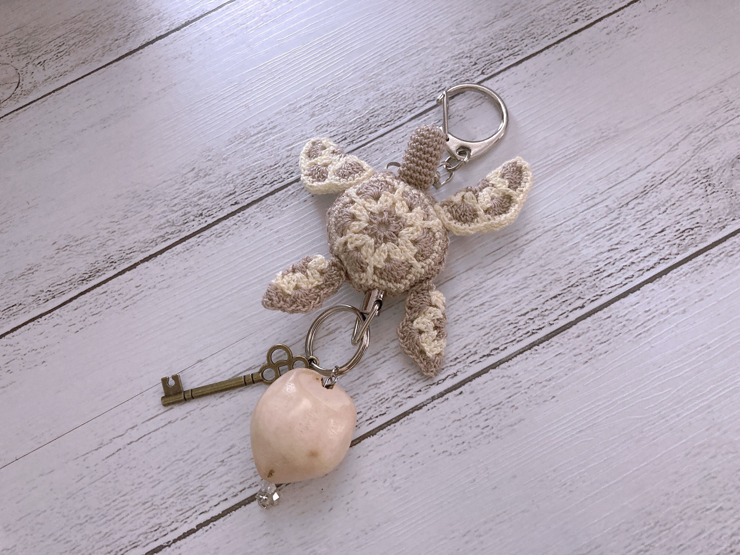 レース糸で編んだフラワーモチーフのホヌのキーホルダーです。紐が伸びるので、カギ等付けてお使い下さい♪