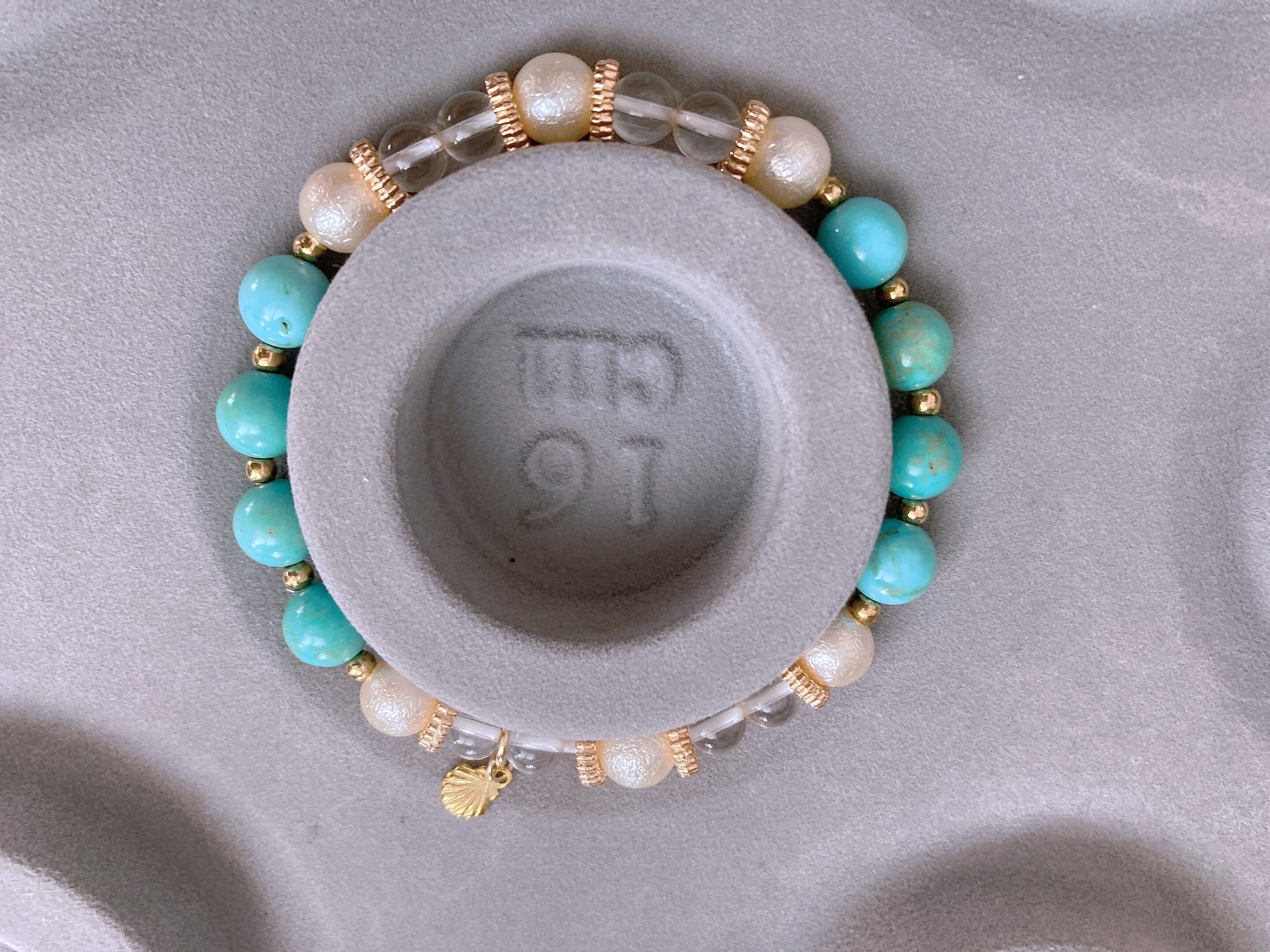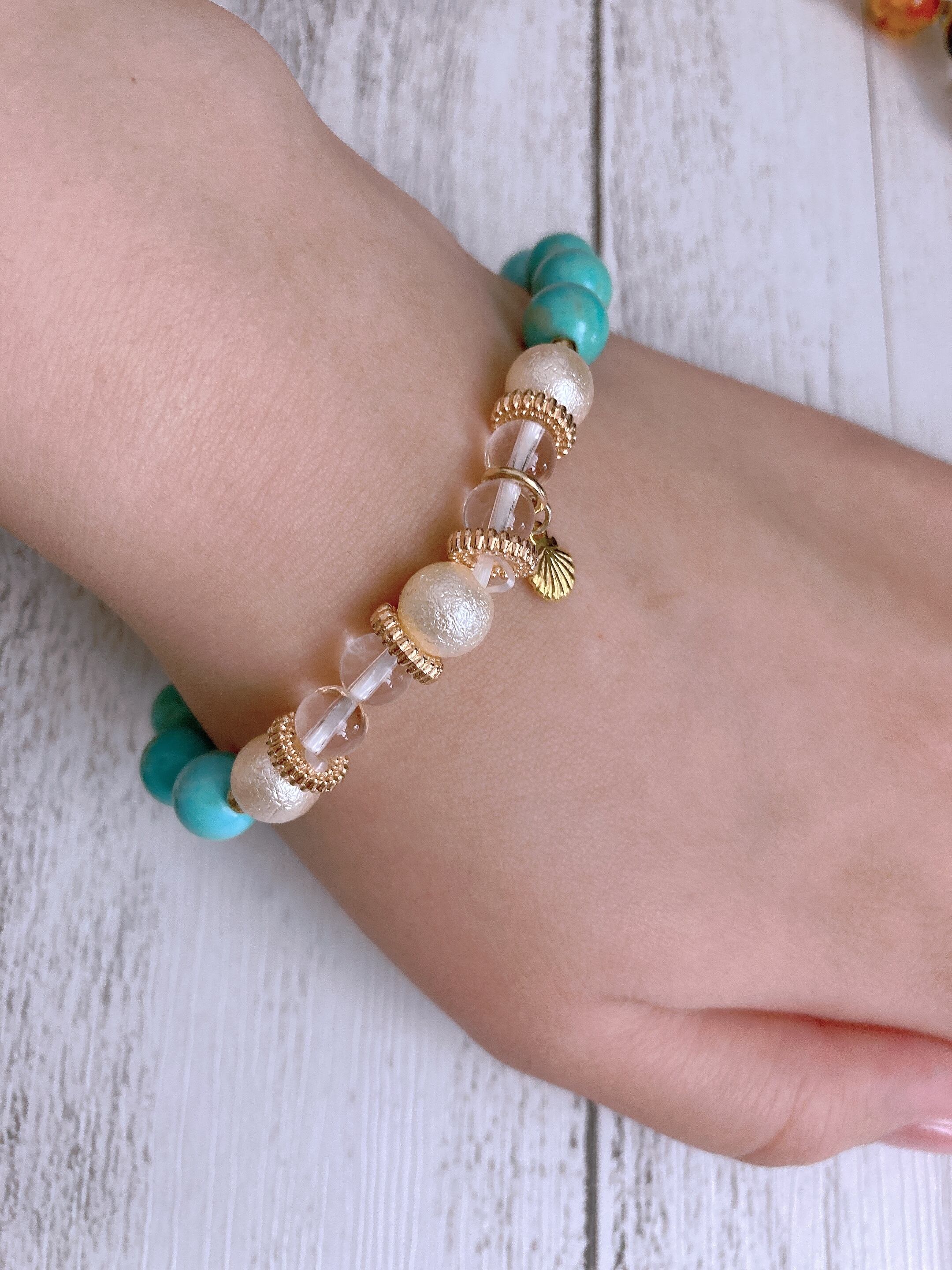 ターコイズ、水晶、パールビーズのブレスレットです。