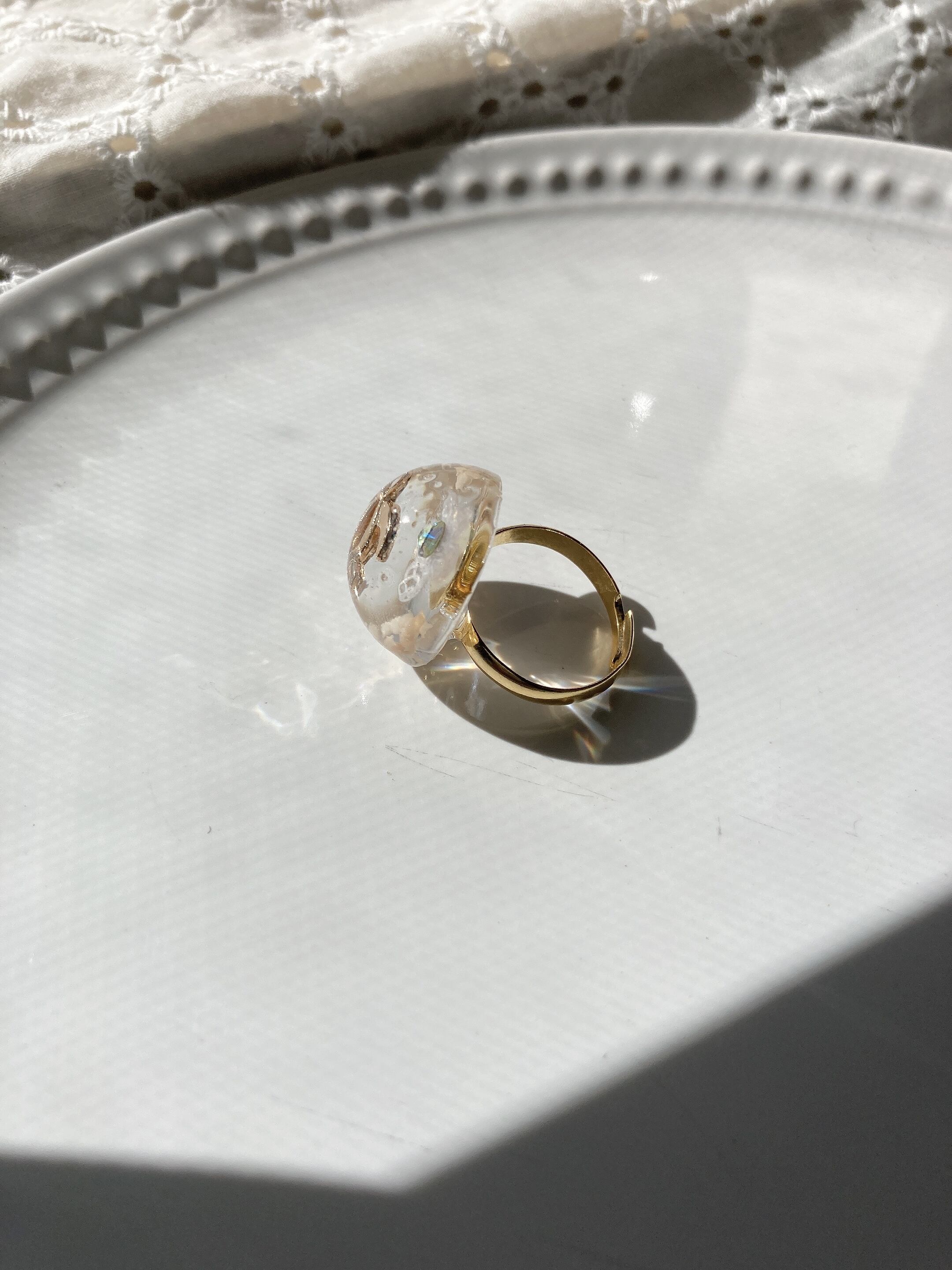 ホヌ、星の砂、糸で編んだお花が入ったレジンで作ったクリアな指輪です^ ^