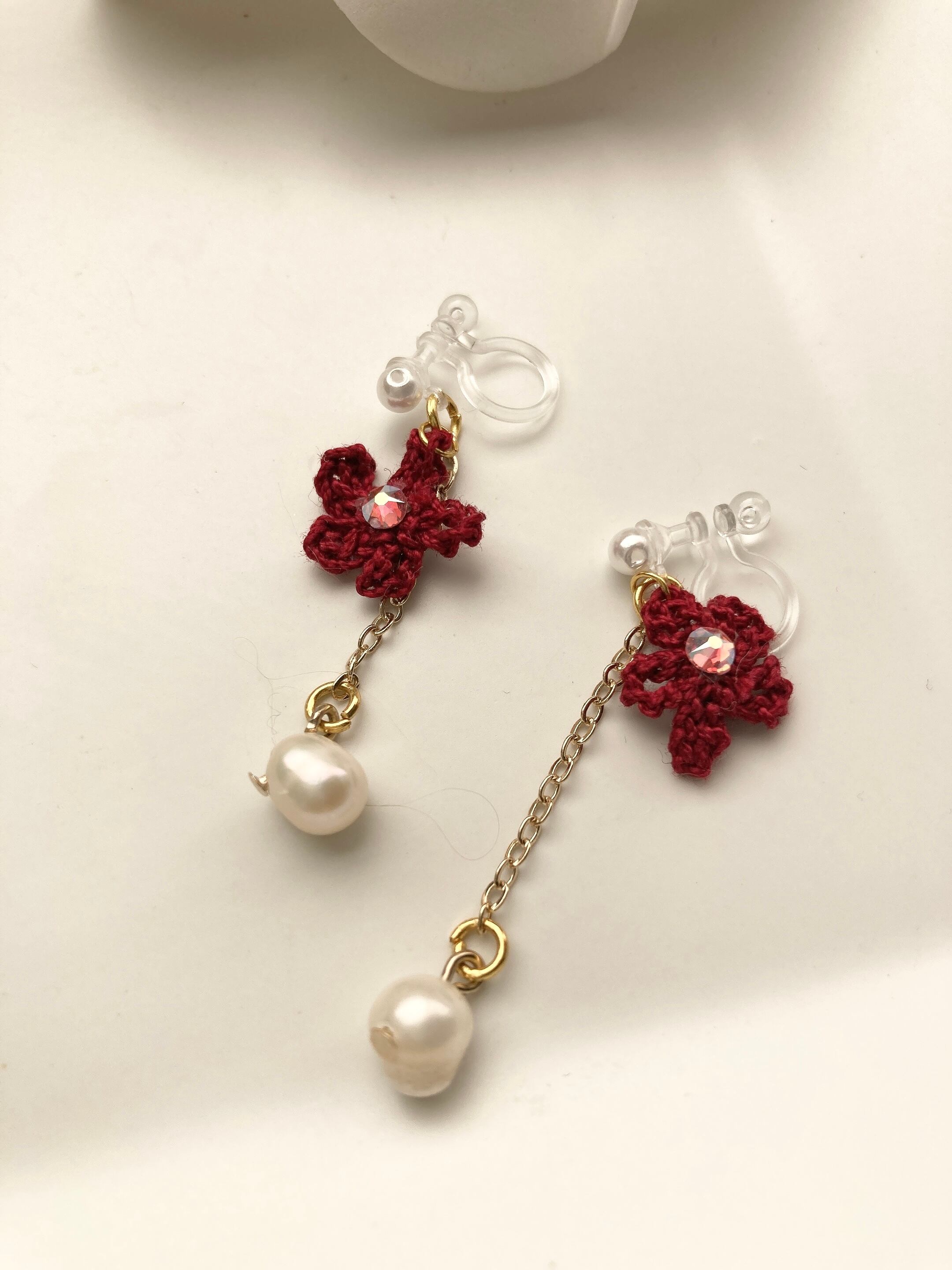 レース糸で編んだ小さなお花のノンホールピアスです。お花にはラインストーンが付いてます♪