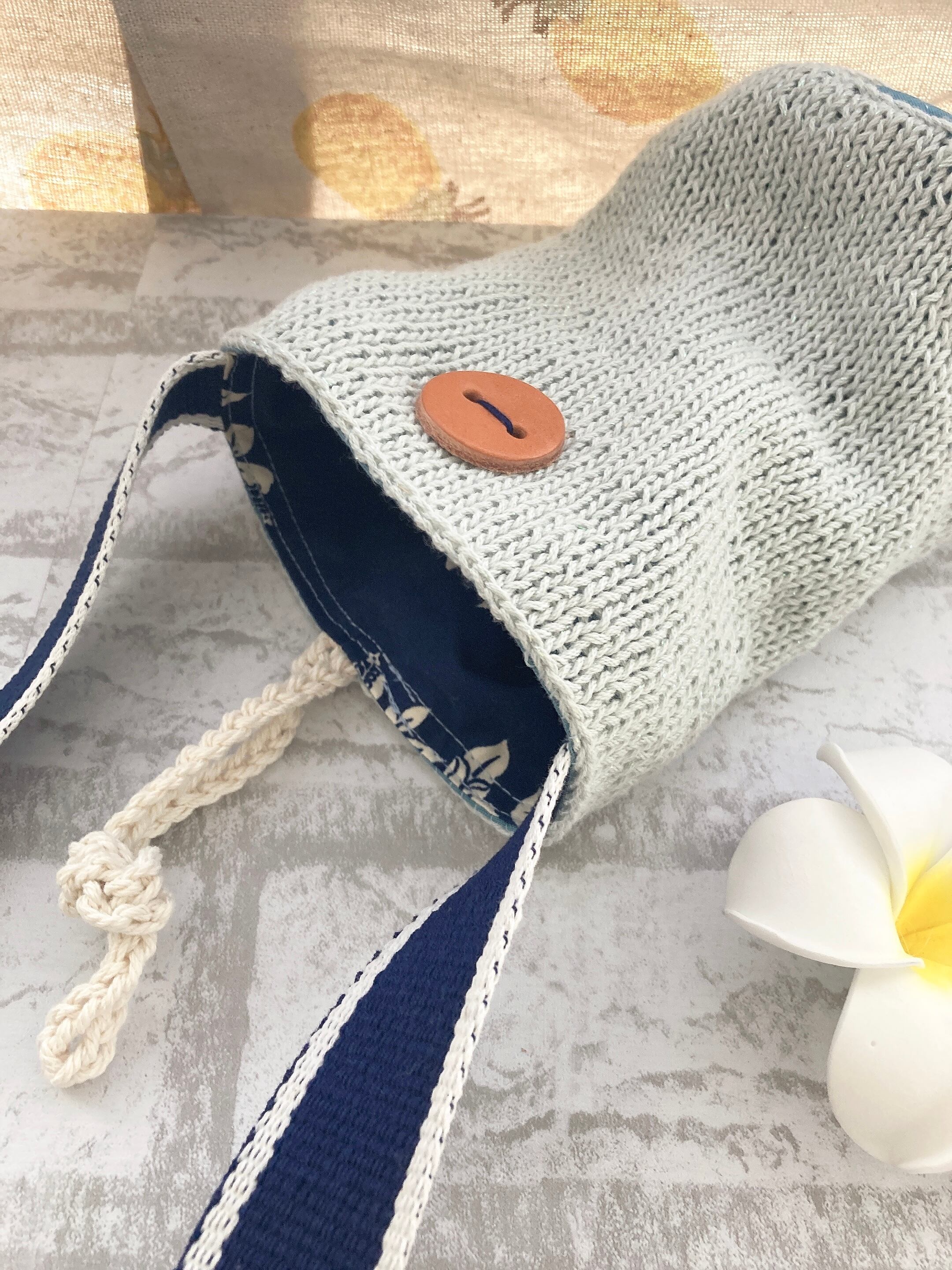 側面はコットンの編み物。底はホヌ柄のハワイアンキルトにレース糸で編んだお花が付いてます♪
