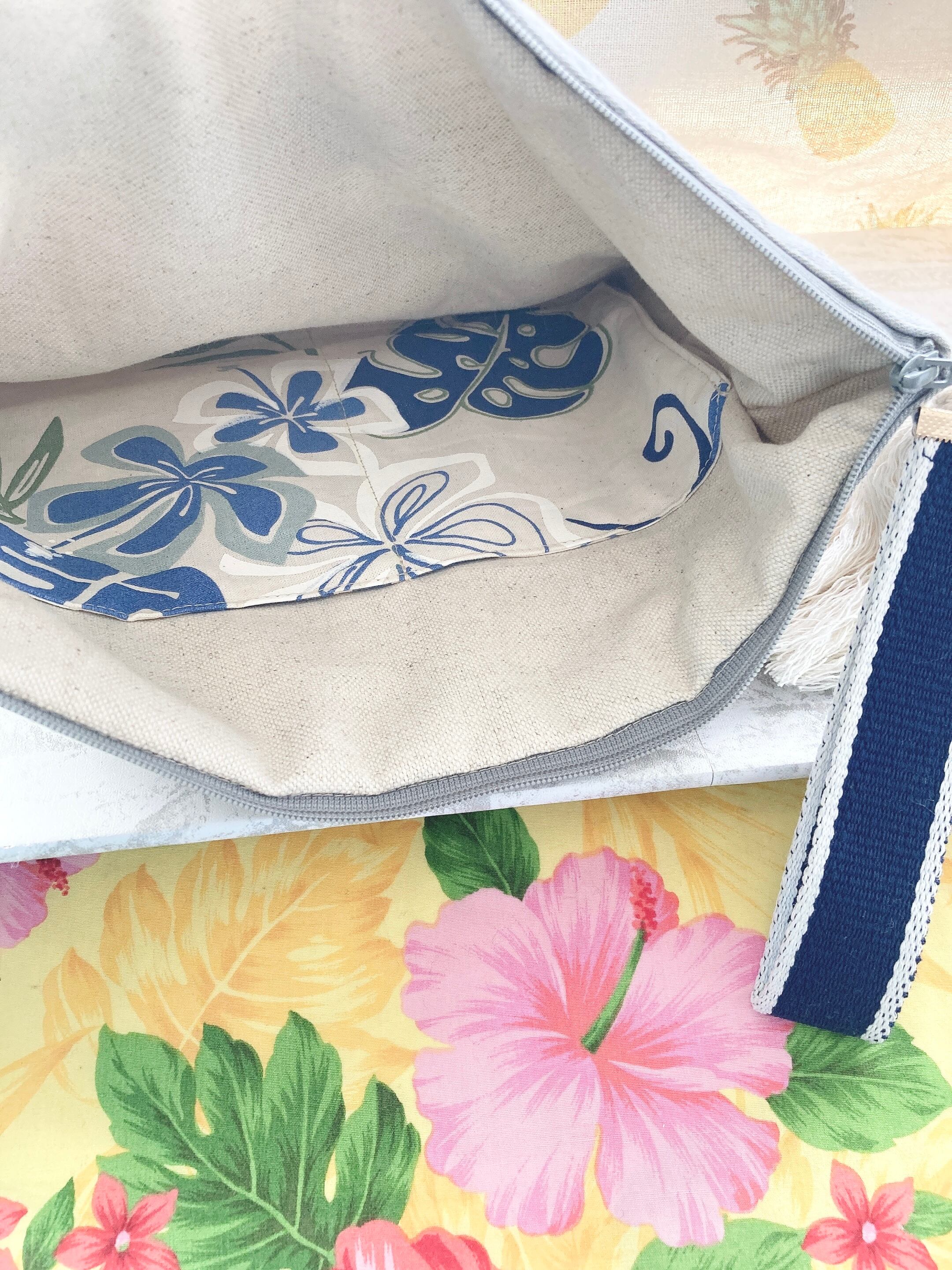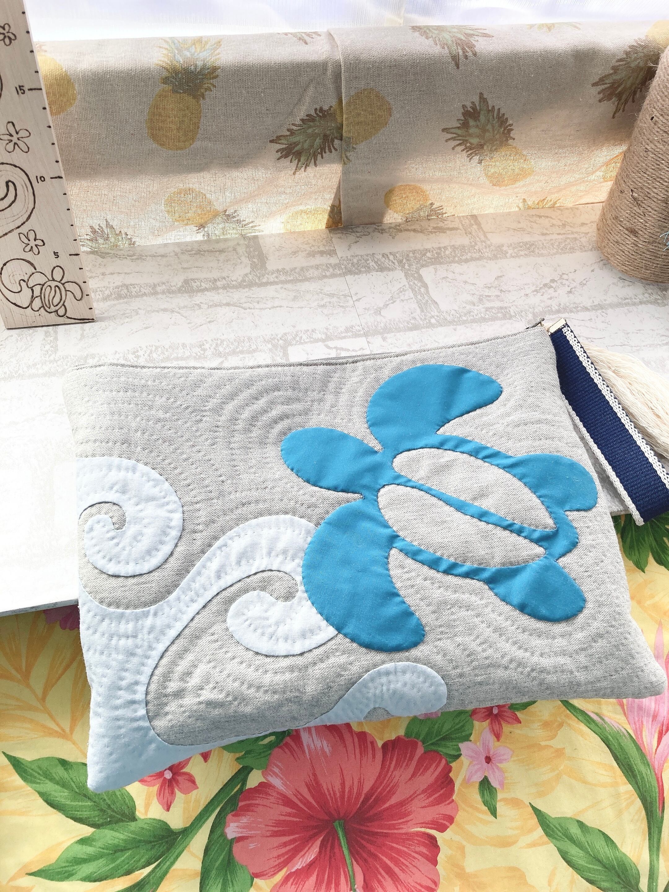 ハワイアンキルトの少し大きめポーチ(ブルーホヌ柄)