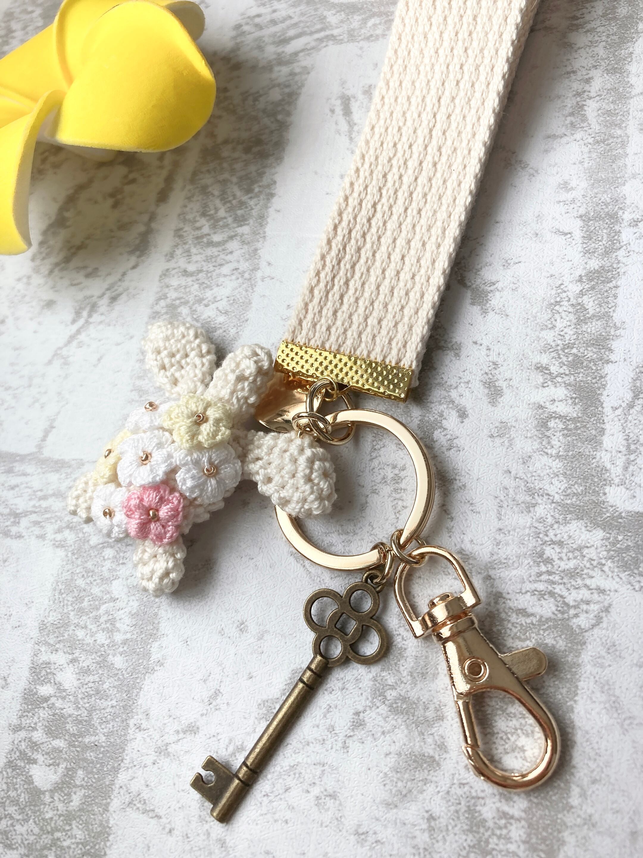 レース糸で編んだ小さなお花を乗せたホヌのキーホルダーです。