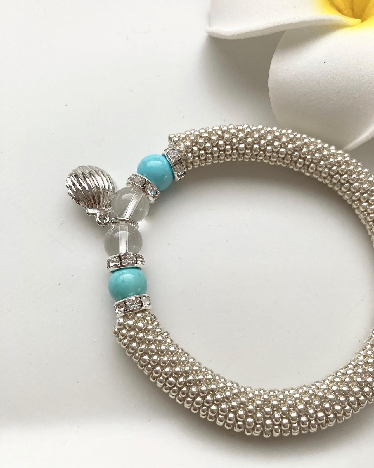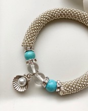シルバーのビーズクロッシェとターコイズ、水晶のブレスレットです。