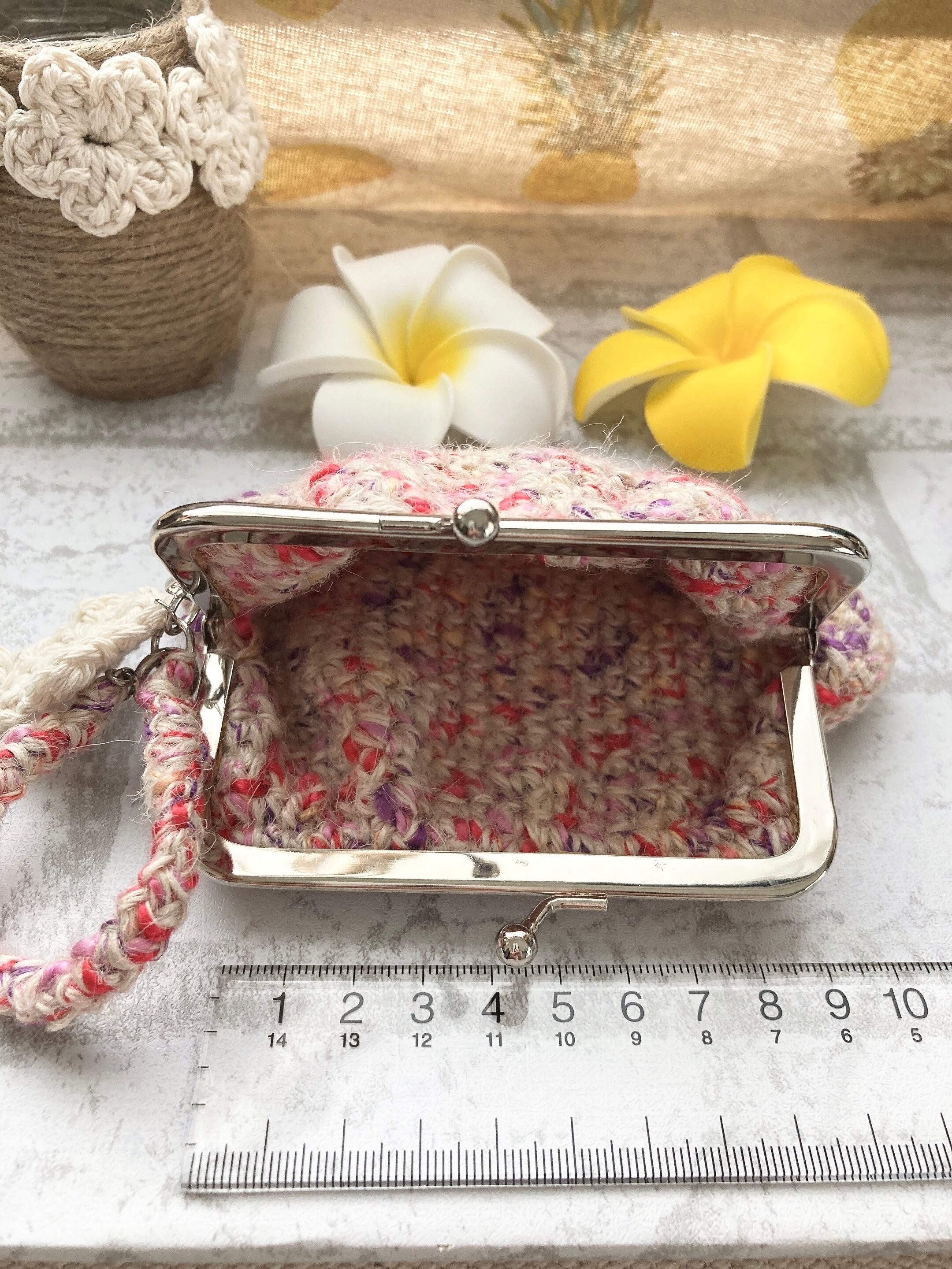 麻紐とアクリルのMIX糸で編んだがま口ポーチです。カードが入るくらいの小さめがま口となってます(^^)