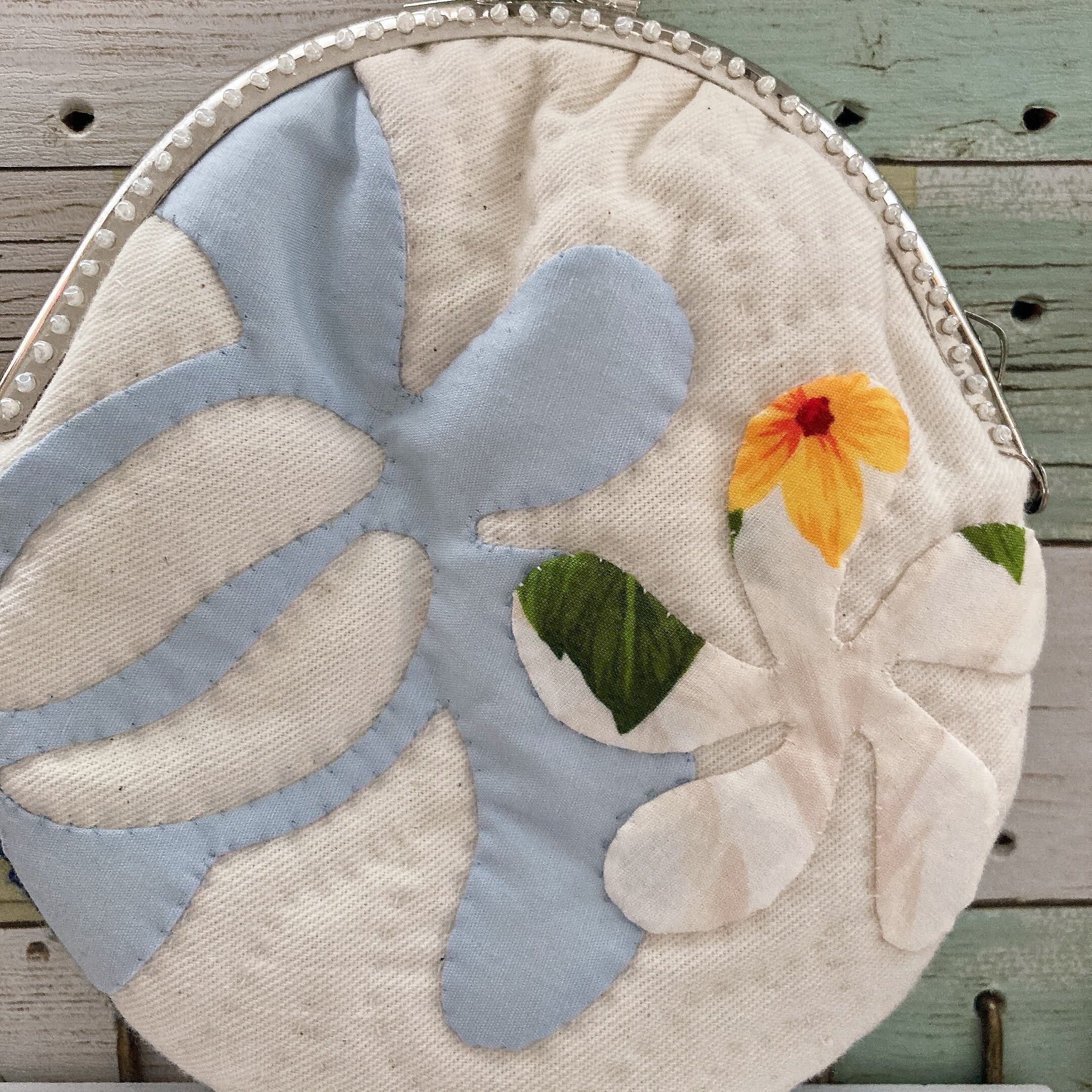 ホヌ、お花柄のハワイアンキルトとコットンの糸で編んだ編み物のmixがま口です。