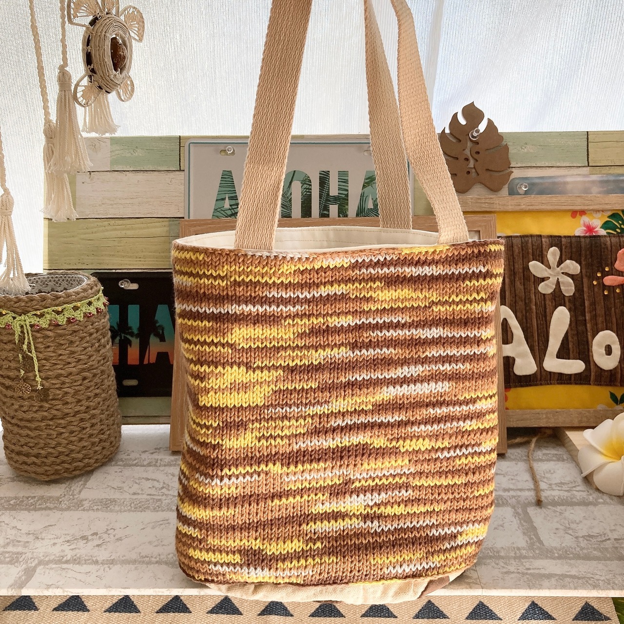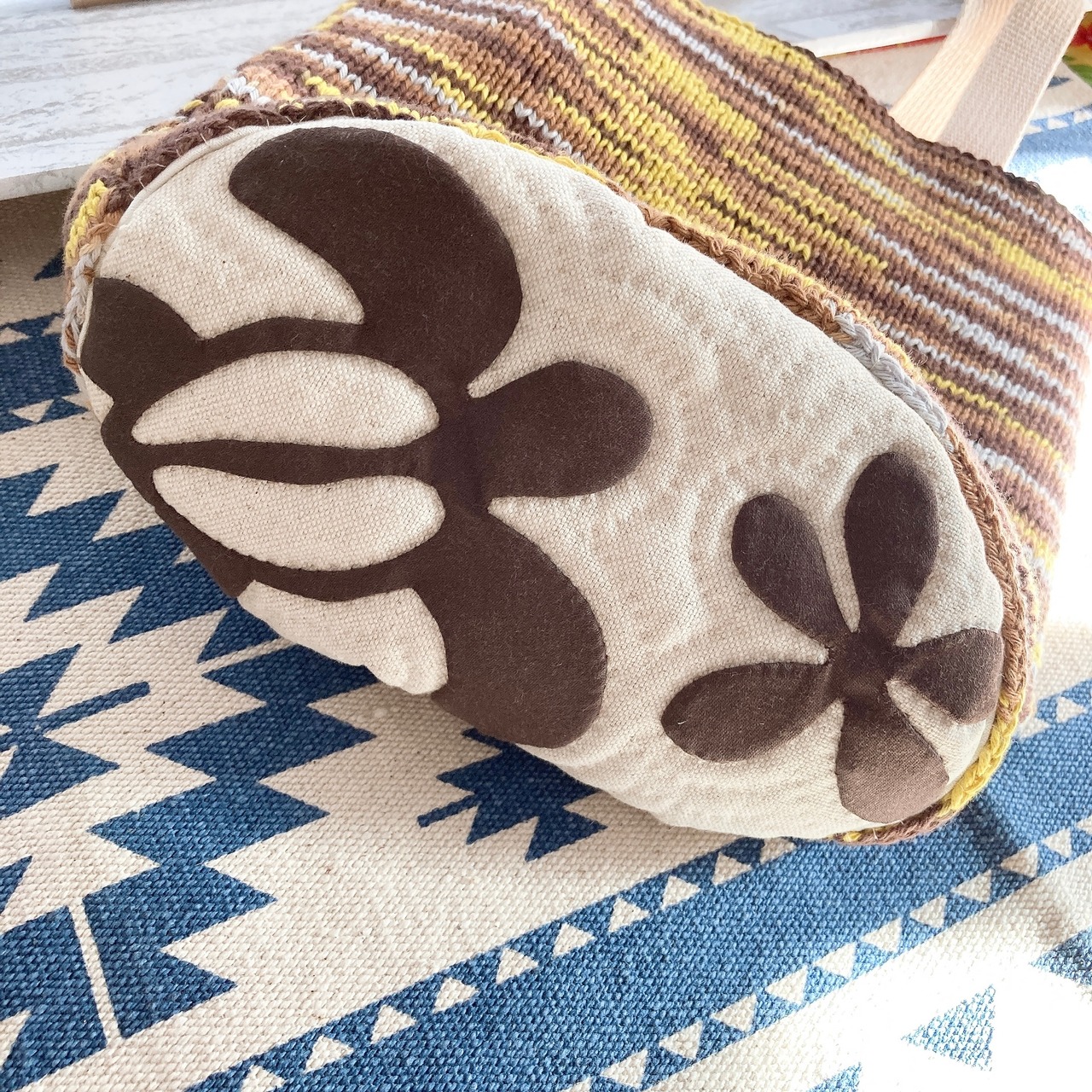コットンの糸で編んだ側面と、ホヌとお花柄のハワイアンキルトのmixバックです♪