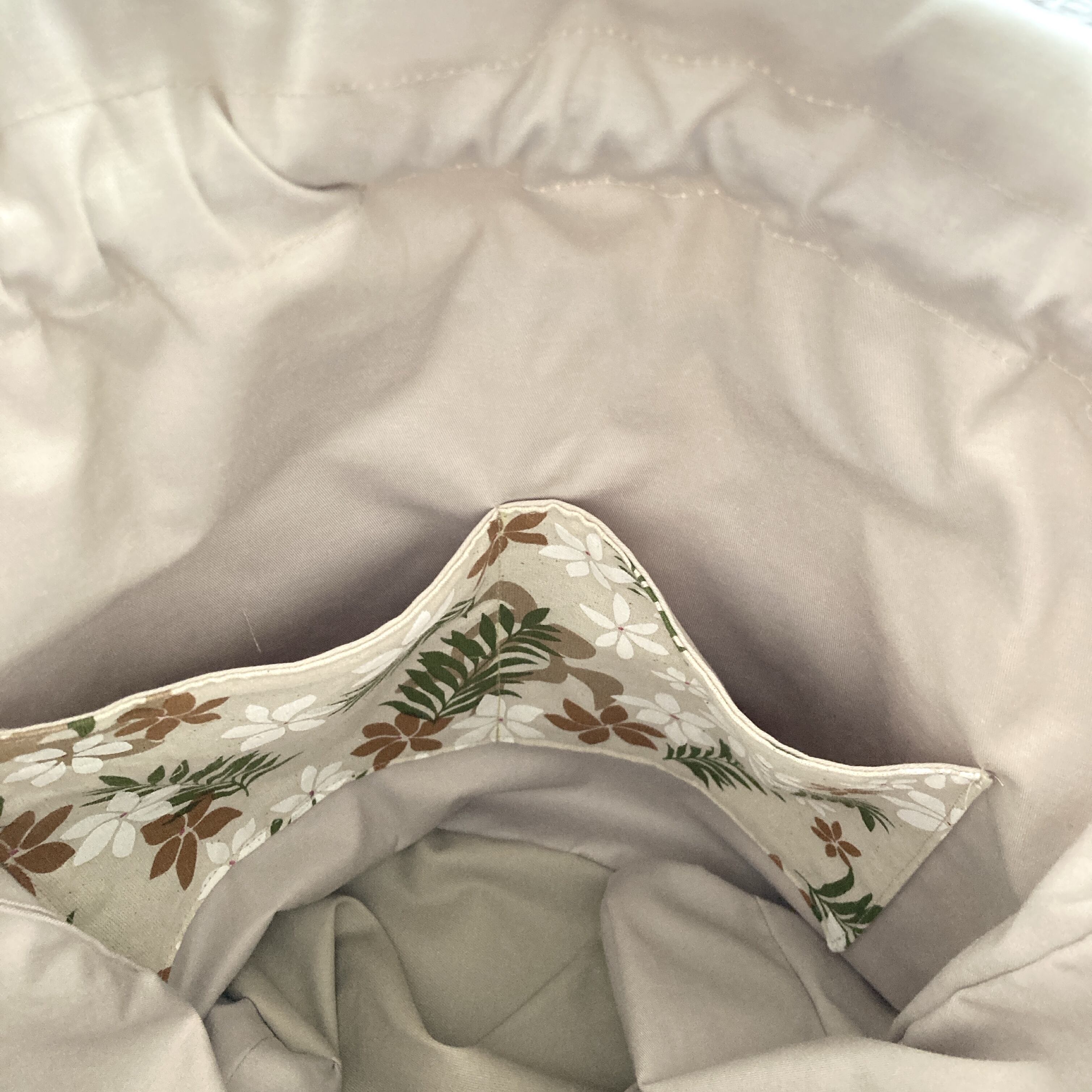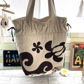 ホヌ、お花、波のモチーフの茶系でまとめた落ち着いたカラーの巾着型バックなのでいろんな洋服に合わせやすいです。