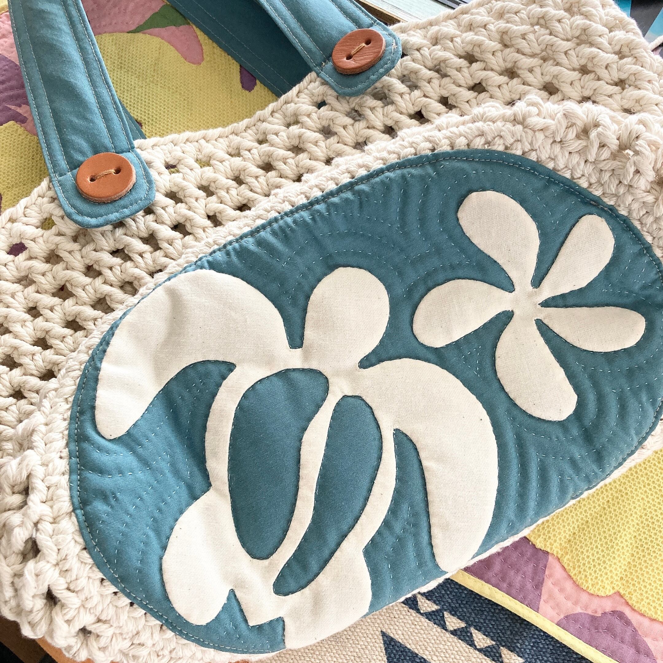 ホヌとプルメリアモチーフのハワイアンキルトの底とマクラメで編んだ側面のmixバックです。