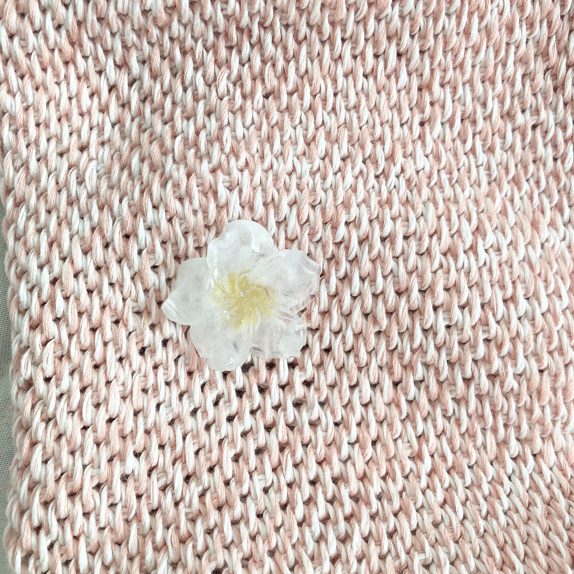 アフガン編みの所にはレジンで作ったプルメリアのピンバッチを付けました♪
