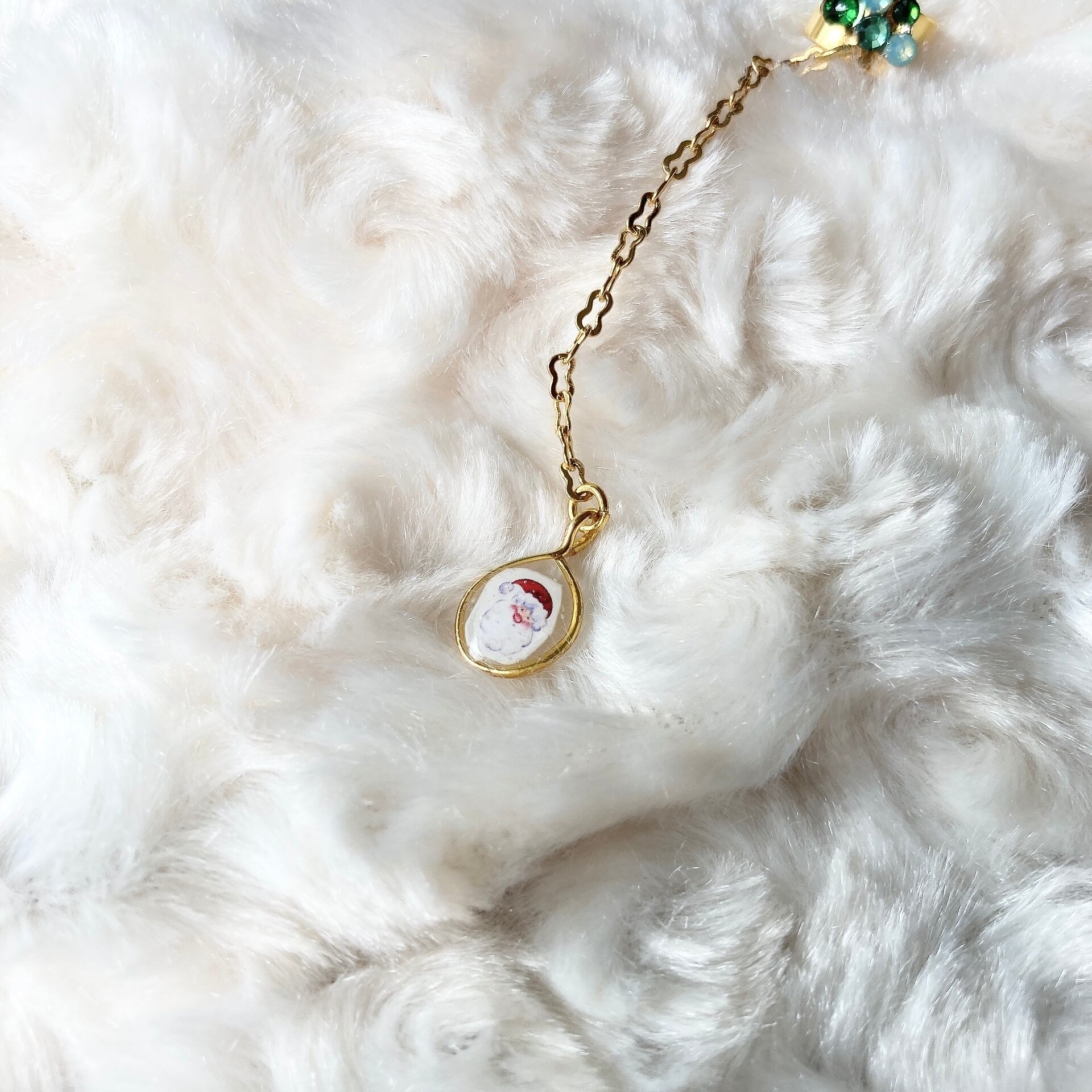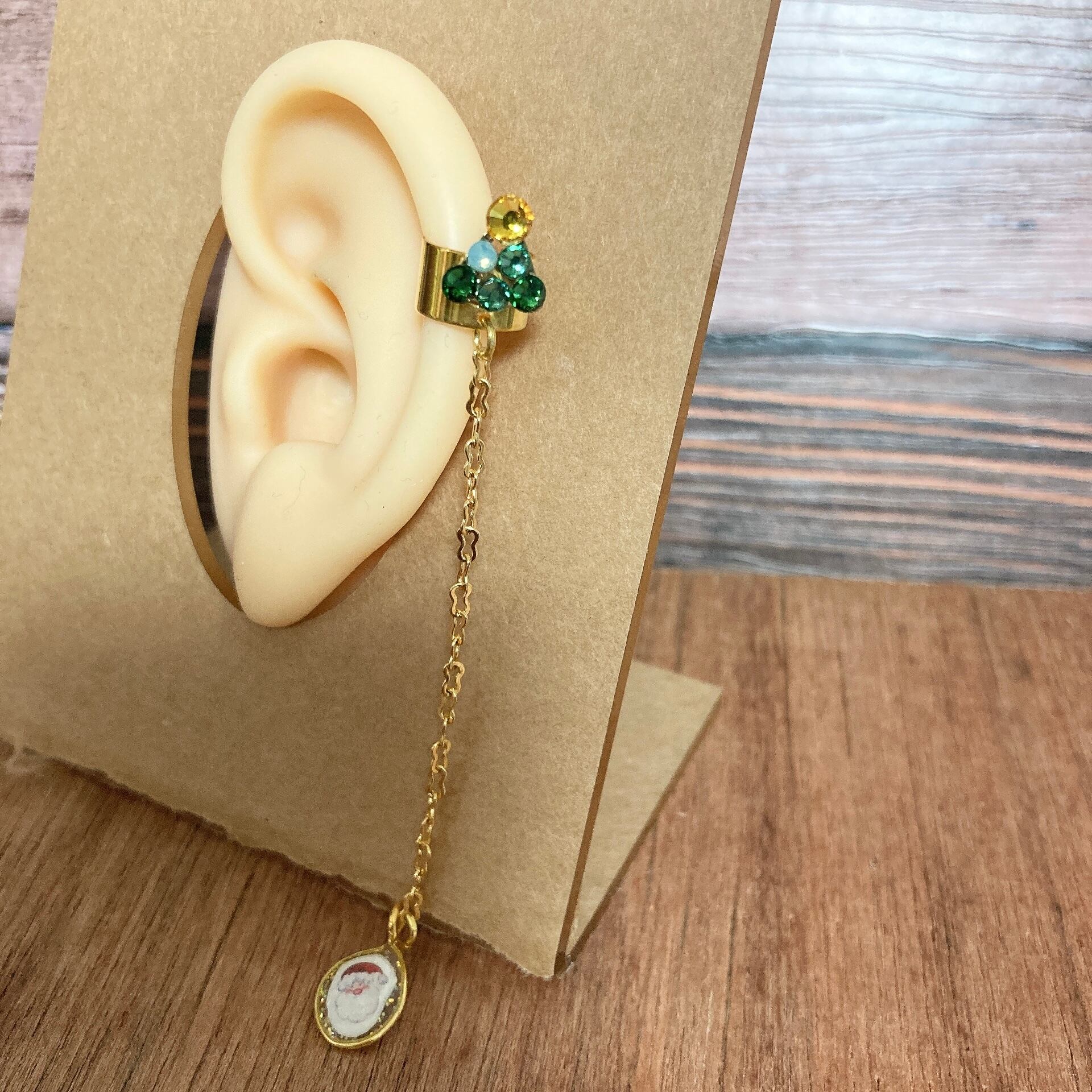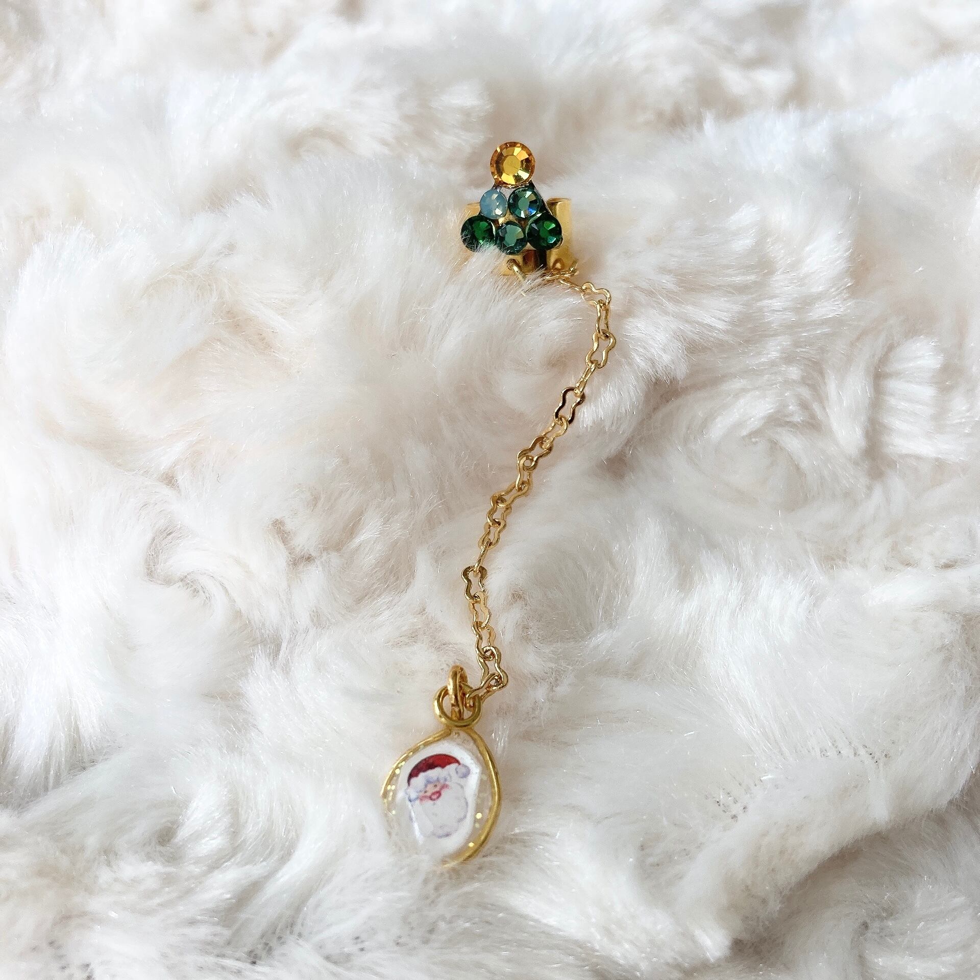 ラインストーンのクリスマスツリーイヤーカフです。 チェーンの先にはレジンで作ったサンタクロースがゆらゆら揺れます。
